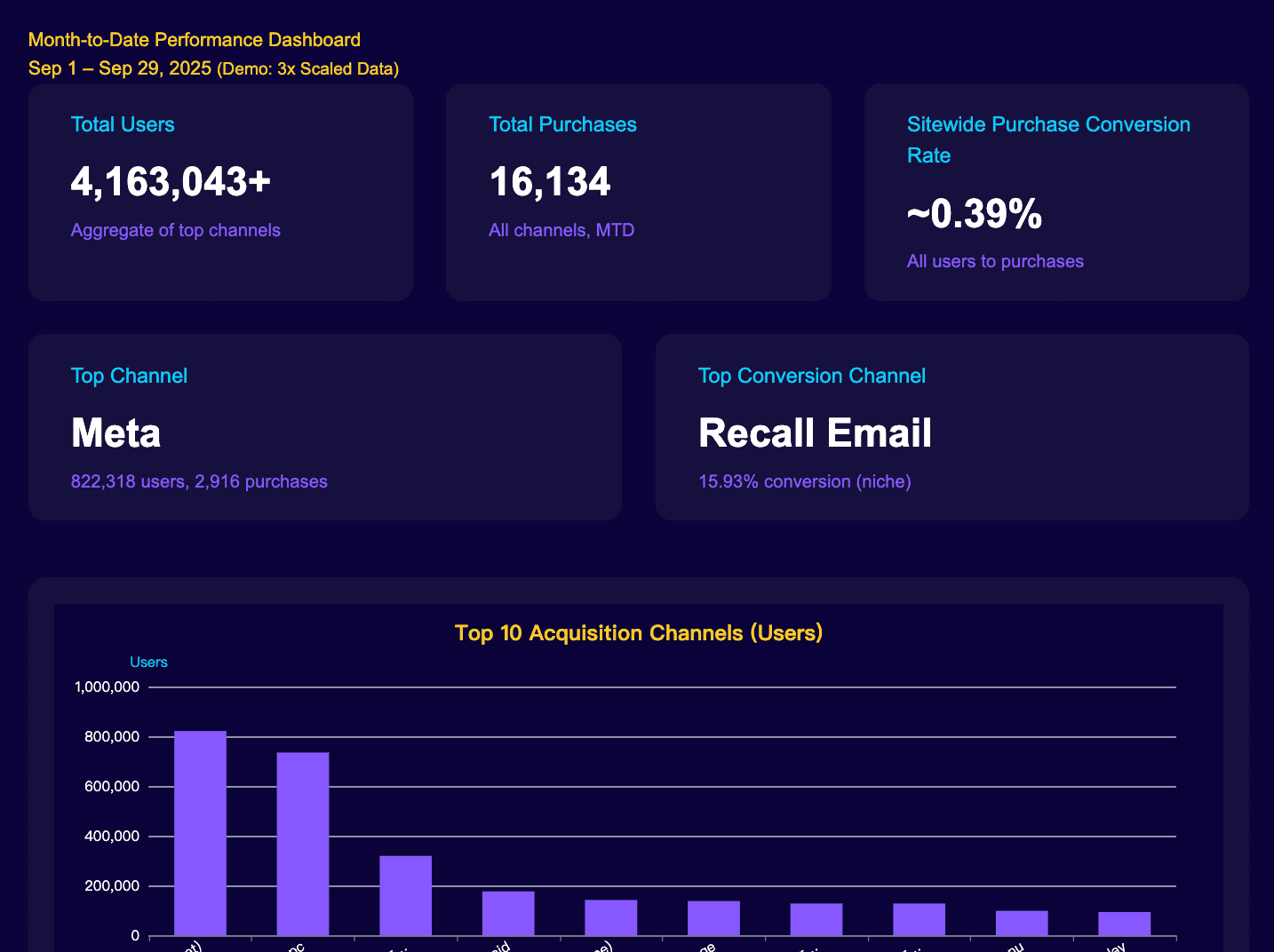 チャートジェネレーター:トレンドの視覚的表現を作成する(例:経時的なトラフィックの折れ線グラフ、チャンネルパフォーマンスの棒グラフ)。