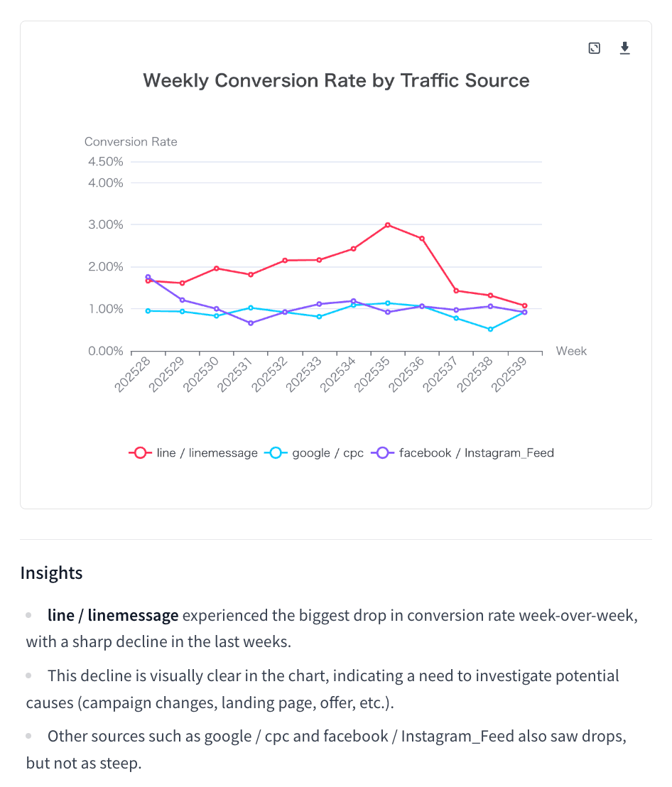 Kocoroの使い方今では、Kocoroを開いて、専属のエージェントに、"先週(日曜日から土曜日まで)の標準的な週次ビジネスレポートを作成し、前週と比較してください "と依頼するだけです。Kocoroは即座に、ユーザー数、セッション数、直帰率、コンバージョン率、トップパフォーマーチャンネルなどの主要な指標をグラフ付きでレポートします。このレポートをチームで直接共有することで、データ主導の効率的な会議が可能になります。